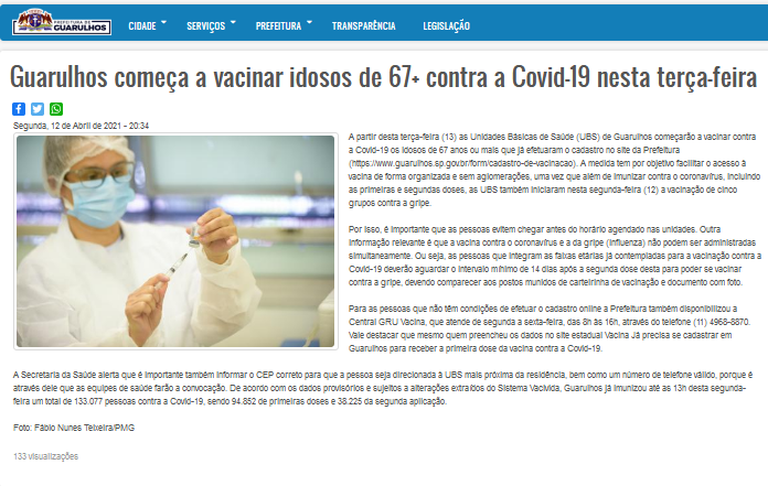 A Secretaria da Saúde alerta que é importante também informar o CEP correto para que a pessoa seja direcionada à UBS mais próxima da residência, bem como um número de telefone válido, porque é através dele que as equipes de saúde farão a convocação. De acordo com os dados provisórios e sujeitos a alterações extraídos do Sistema Vacivida, Guarulhos já imunizou até as 13h desta segunda-feira um total de 133.077 pessoas contra a Covid-19, sendo 94.852 de primeiras doses e 38.225 da segunda aplicação.